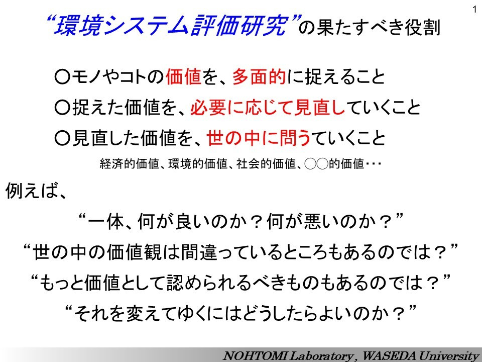 納富研究室は、「環境システム評価研究」という研究指導名で活動を営んでいます。環境やエネルギーに対する様々な課題や問題を解決し、より望ましい社会を作り上げてゆくためには、いろいろなアプローチがあります。政策的アプローチ、技術的アプローチ、経済的アプローチ、民間主導活動的アプローチなど。それら多様なアプローチの実施に当たって、果たして環境面はもとより、社会面、経済面、そして地球システムにとって意味のあるアプローチであるのかどうかを、できる限り客観的に見定める必要があります。そのような”評価”を基本として、様々なアプローチの是非を吟味する、それが「環境システム評価」です。
