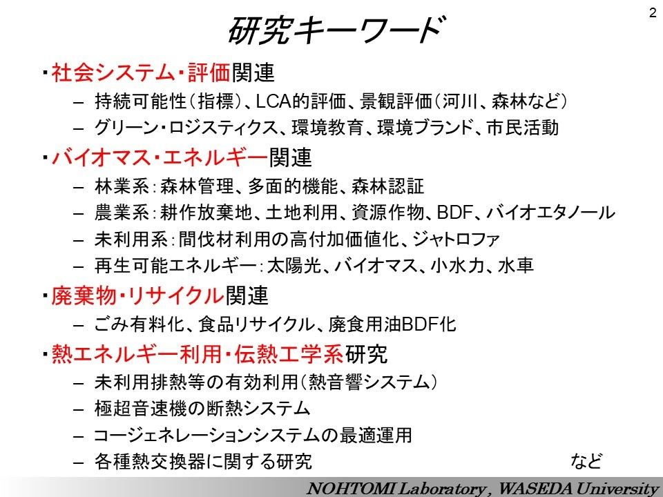 The researches conducted in our laboratory are based on mechanical engineering and thermal engineering, but environmental researches need to make use of knowledges and experiences of sociology, economics, ethics, philosophy, ecology, agronomy, forestry and other disciplines. We expand and develop our research to new academic fields.