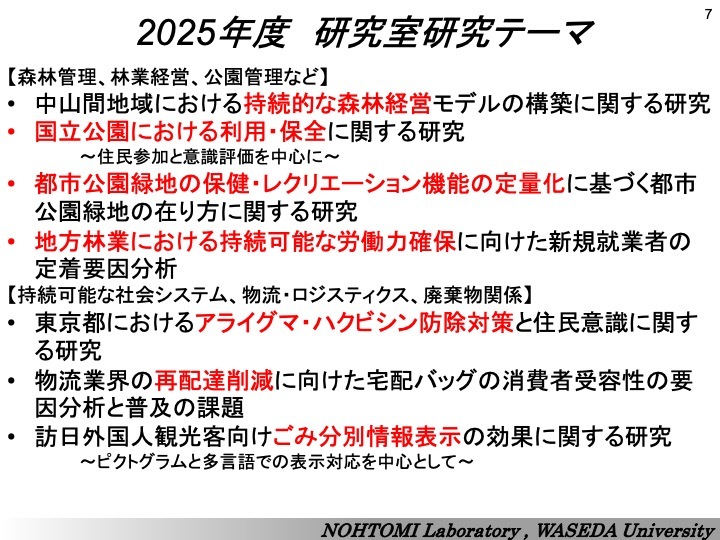 故に、納富研究室では、取り組む研究テーマに求められる学問分野・領域も、例えば、社会学、経済学、倫理学、哲学、生態学、農学、林学、その他工学など幅広い知識や経験が必要となります。でも、最初からこれらの学問分野を十分に修めてからでないと研究に取り組めないというわけではありません。一つの分野のみにこだわること無く、様々な知識や経験を駆使しながら新しい領域を開拓・創造する気概を持って活動を展開しています。